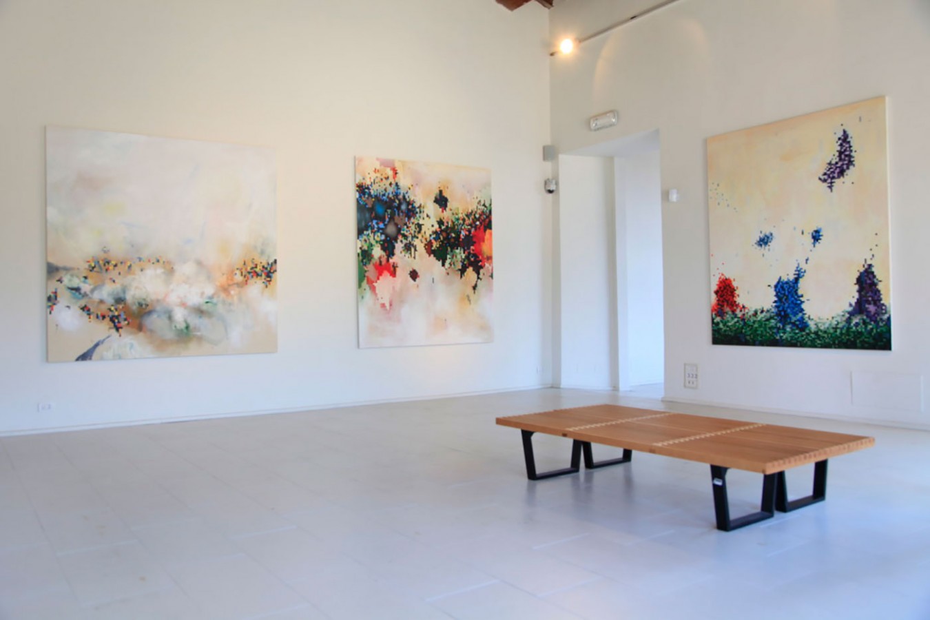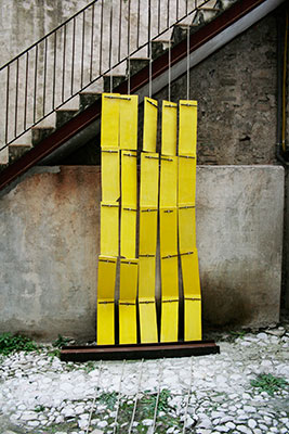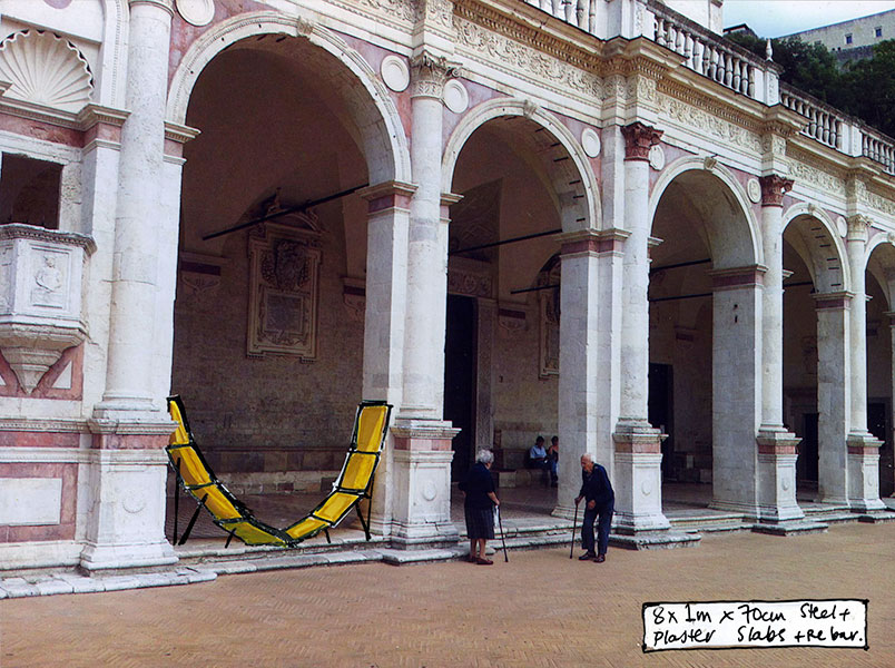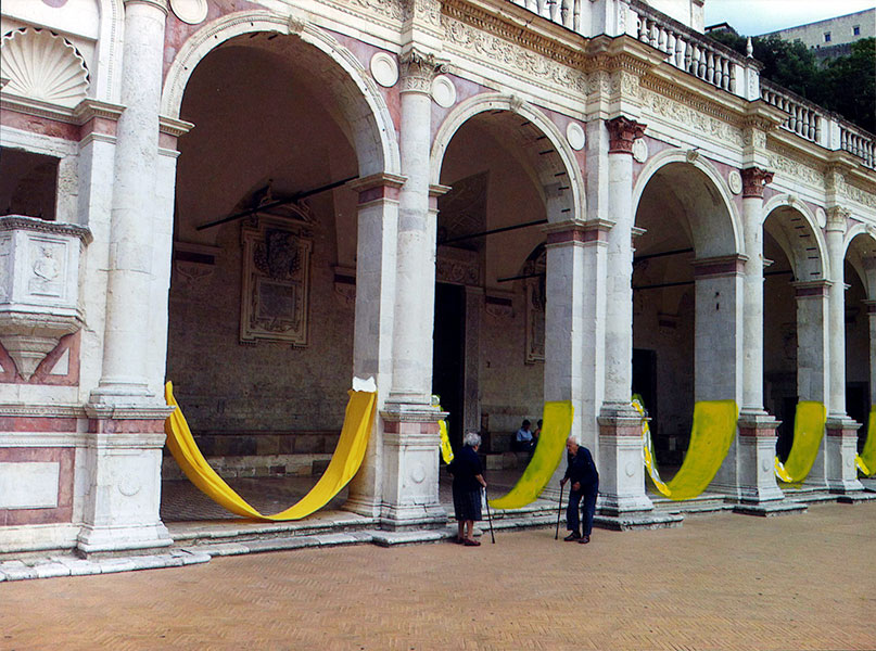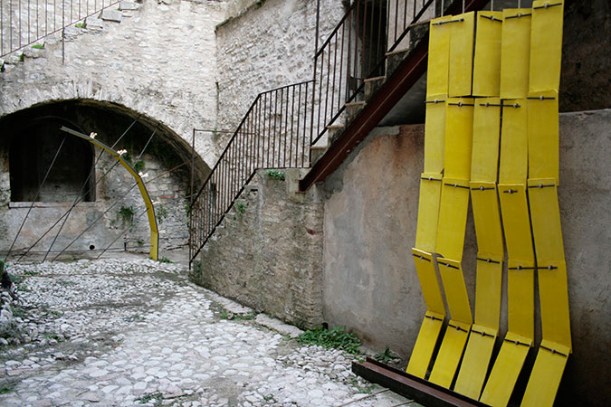 Spoleto’s vibrant artistic life began to attract internationally acclaimed artists, in addition to Anna Mahler; the eminent American artist Sol LeWitt began to work in Spoleto from the 1970s onwards, and finally relocated to the city from New York around 1980. LeWitt bought a house perched on a hillside overlooking the town, perched above a vast chasm spanned by a Roman aqueduct, the Ponte delle Torri, and later a studio in the town’s historic centre. Following the lead of fresco painters centuries earlier, LeWitt began to embellish the walls of villas owned by friends with his own striking geometric forms, and producing designs for local ceramicists.